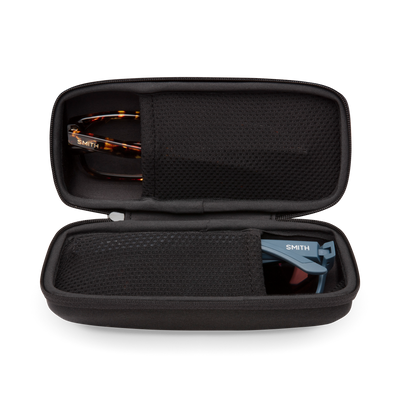 Étui à lunettes de soleil/de vue avec fermeture éclair et doublure intérieure. Permet de ranger en toute sécurité deux montures de lunettes de soleil ou de vue avec une courbure de verre bases 4 et 6. L’étui de voyage ne convient pas aux modèles de lunettes de soleil à écran ou aux verres avec une courbure de base 8.
